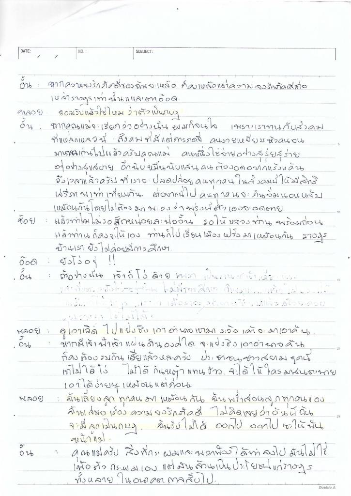 MAE PLOI: The honorable Kukrit created me with the intention of making me an exemplary Thai woman, a role model who is filled with patriotism and love for the nation. And yet, he now calls me stupid. Well, if that is so then all Thais must be stupid too! (audience claps) and so is the honourable Kukrit himself! (applause) I’m so upset! I’m so very upset!