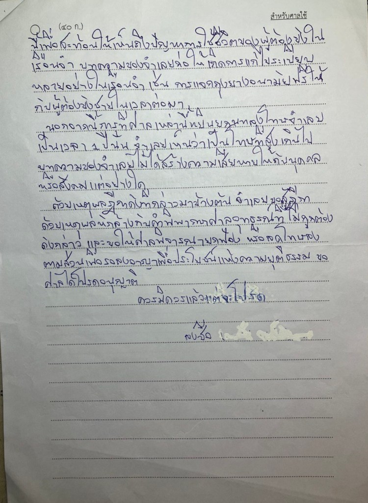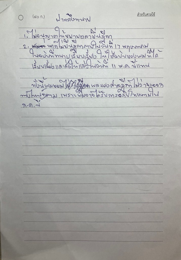 In any case, I accept the petition being dismissed the Supreme Court’s decision no matter which way it turns out, because I may be granted pardon by this July. [This likely refers to the royal pardon given en masse annually on the occasion of King Vajiralongkorn’s birthday, the 28th of July. –trans.]