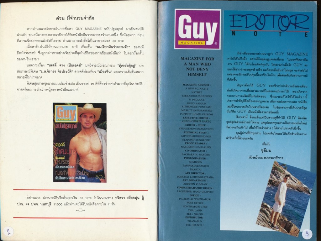 Looking back three decades will throw the conundrum of gay acceptance into high relief. In 1991, Guy Magazine, a “magazine for a man who does not deny himself,” was launched as an alternative to Thai gay magazines flourishing at the time. As a compromise, Guy featured male models in the nude like other magazines, but the nudes were intended to be more tasteful than titillating. It did publish erotic stories, but of a more literary or educational bent. In short, Guy strove for the edification of Thai gay men. Still, its first issue was confiscated in the hundreds for being considered an obscene publication, according to the beleaguered editor’s note on Volume 3.