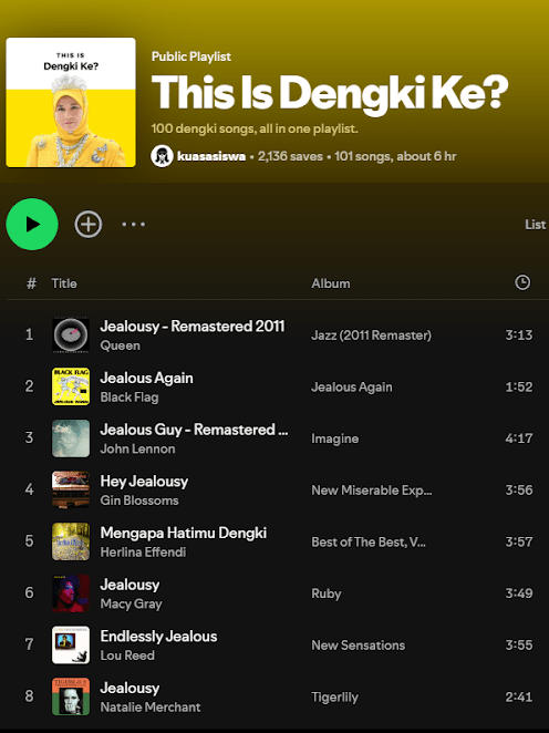รายงานข่าวเอเชียเซ็นทิเนิลออกมาวันเสาร์ ไม่ทันไร วันจันทร์พระราชินีก็ทรงดีแอคทิเวตแอคเคาท์อินสตาแกรม มาวันพุธก็ปรากฏเพลย์ลิสต์ชื่อ “This Is Dengki Ke?” ทางสปอติฟาย หน้าปกเพลย์ลิสต์เลียนแบบดีไซน์มาตรฐานของเพลย์ลิสต์รวมเพลงศิลปินบนแพล็ตฟอร์ม นั่นคือทำเสมือนว่าสมเด็จพระราชินีเป็นศิลปินชื่อ “Dengki Ke?” เจ้าของเพลง 101 เพลงที่มีคำว่า jealous หรือคำว่า dengki ในชื่อหรือในเนื้อเพลง