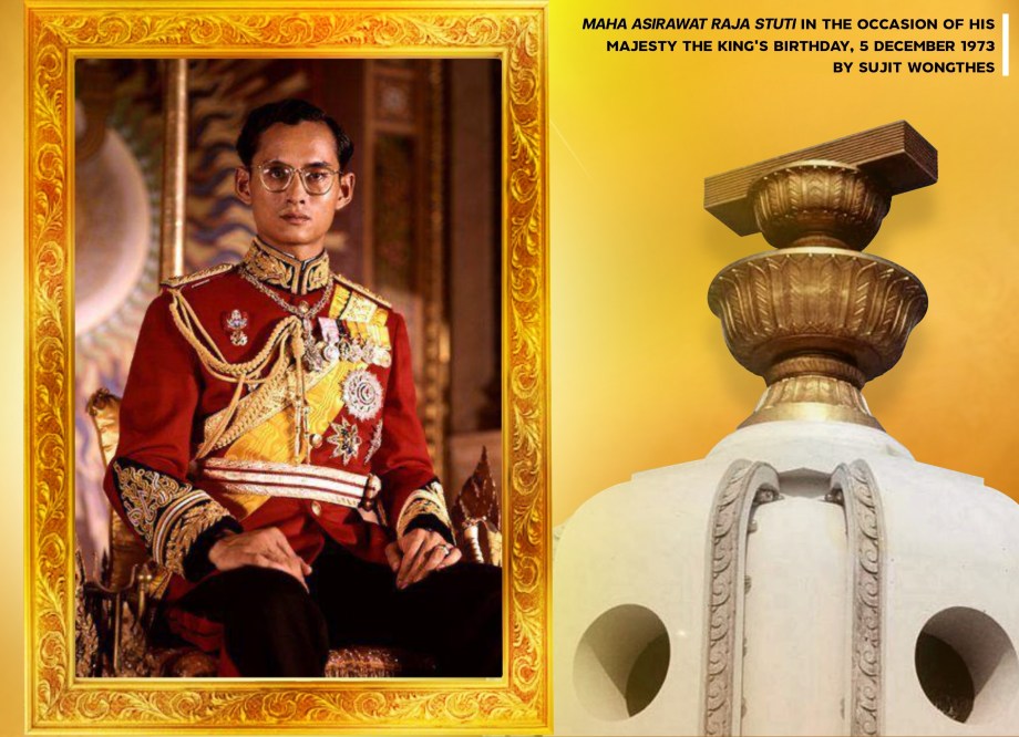 Written by Sujit WongthesTranslated by Nalin Sindhuprama [คลิกที่นี่เพื่ออ่านต้นฉบับ “มหาอาเศียรวาทราชสดุดี เนื่องในวันเฉลิมพระชนมพรรษาพระบาทสมเด็จพระเจ้าอยู่หัว 5 ธันวาคม 2516”] In 2012, controversy erupted in Thailand over a few lines of verse in praise of King Bhumibol on the occasion of his 85th birthday. The praise poem (asirawat or asiarawat) graced the … Continue reading Maha Asiarawat Raja Stuti on the Occasion of His Majesty the King’s Birthday, 5 December 1973